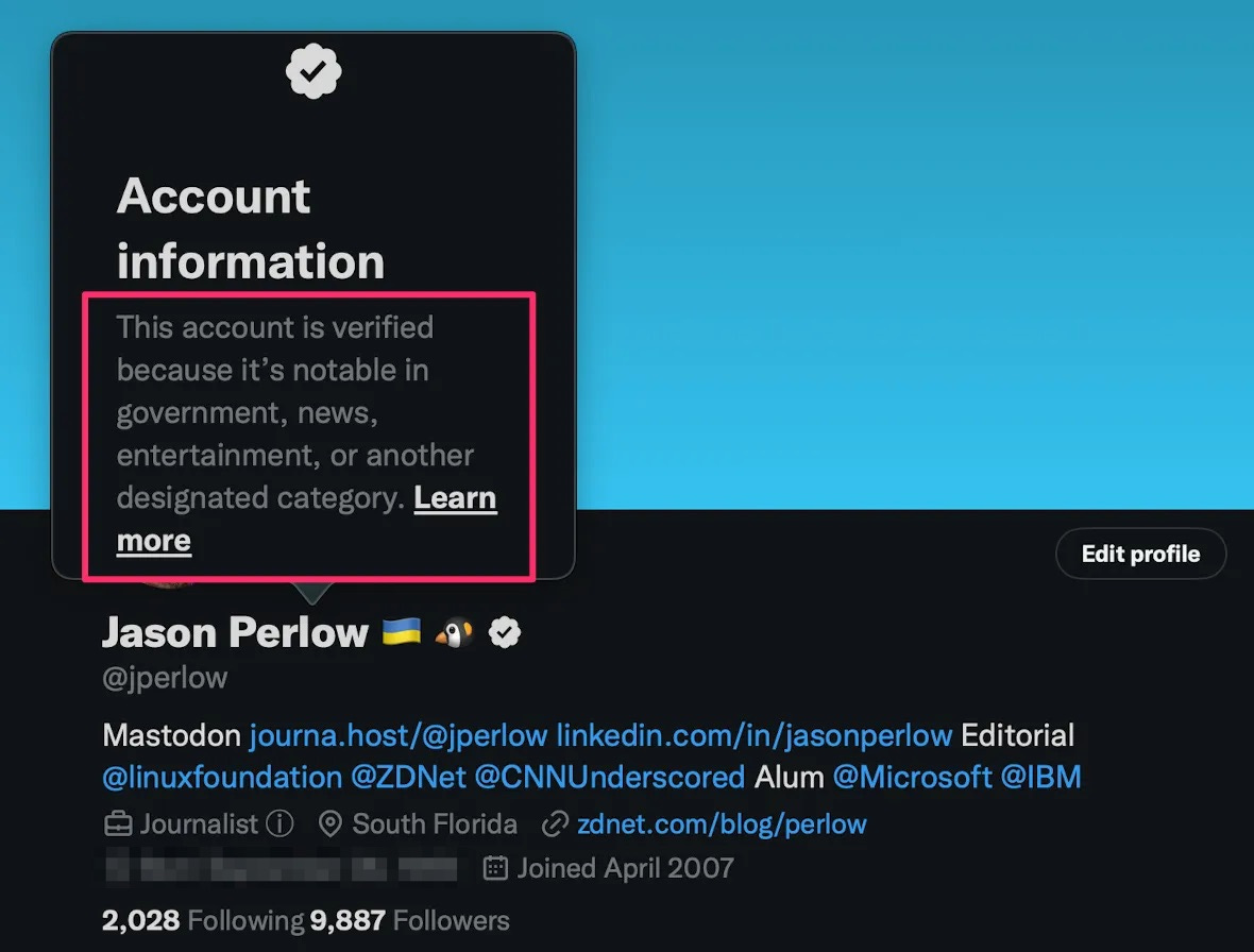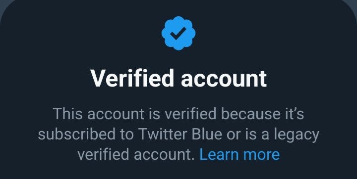 So far, only a few Twitter accounts that have publicly announced that they refuse to pay for Blue — such as the New York Times — have had their legacy checkmarks removed. For a few days after April 1, Twitter had an ambiguous description for Verified accounts, which looked like this: