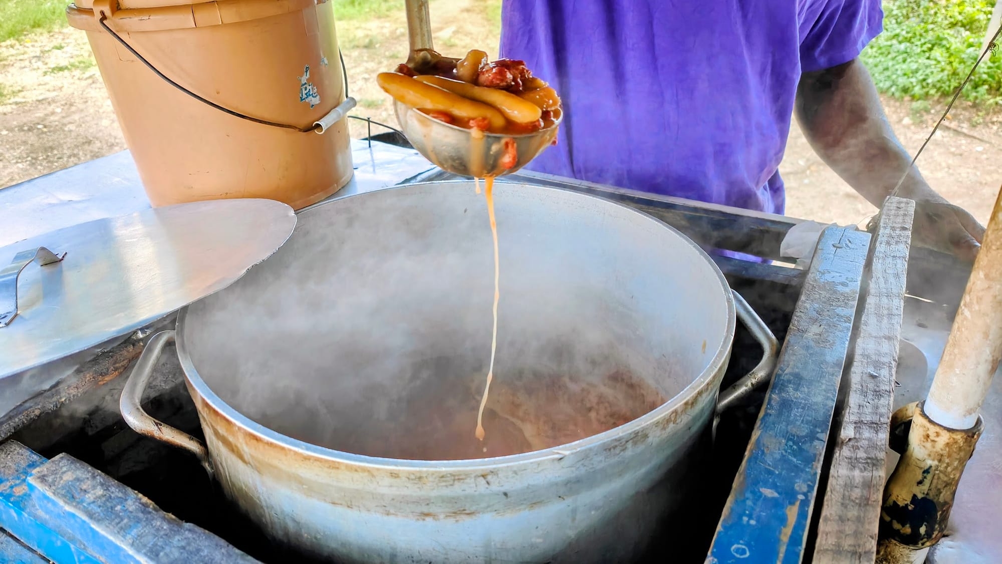 From there, he brought us to a street vendor cooking soup in a steaming pot on the roadside. Chicken soup was ladled into a Styrofoam cup, rich and peppery, the kind you eat standing up with no place to sit. Ricky stood beside us in his blue cap and green rugby jacket, talking to the vendor as if he were an old friend. We had a shot of overproof rum and cups of sorrel drink from another nearby vendor. None of this was planned. Ricky just knew where to go.