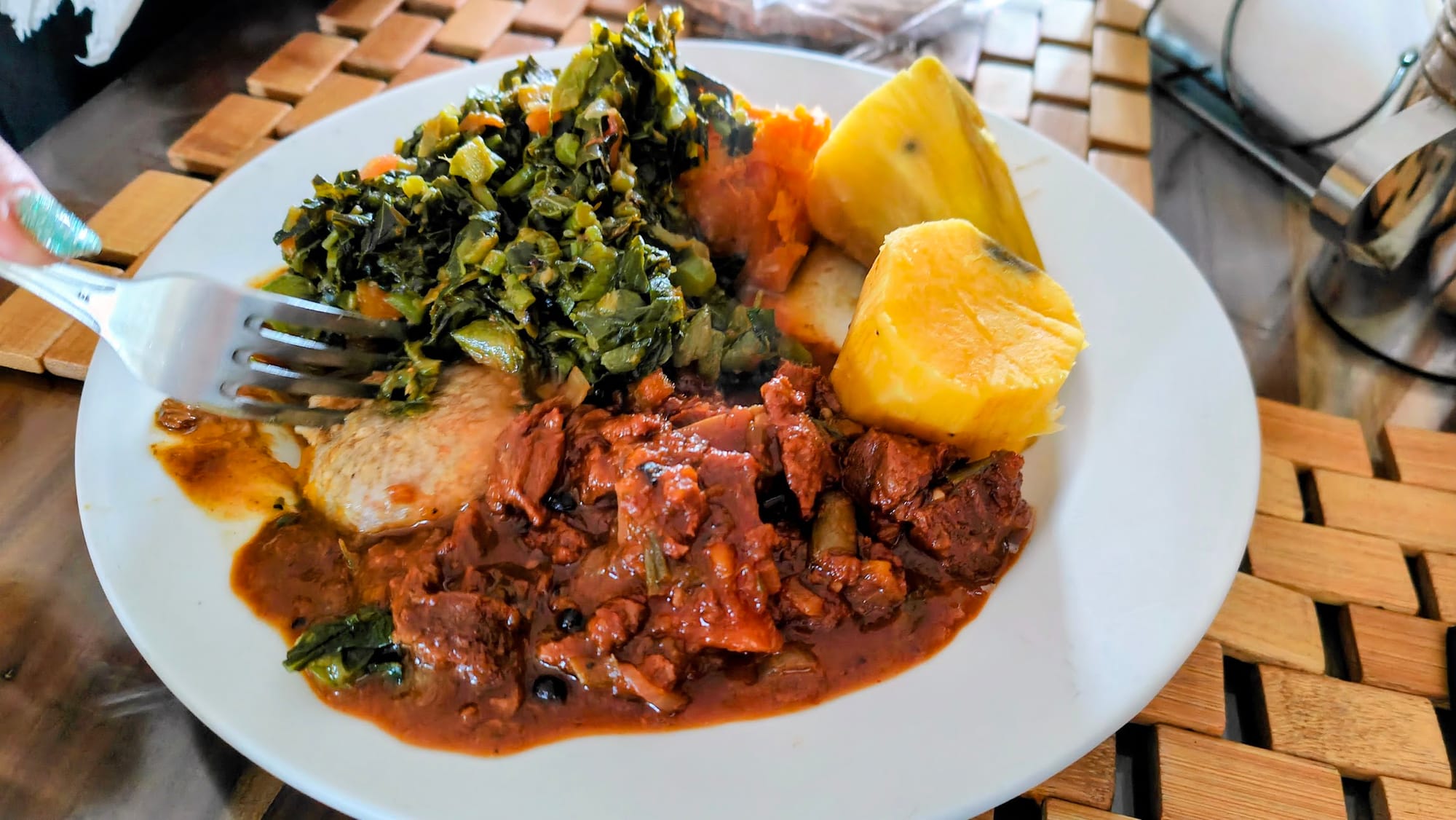 Our bus driver from the airport had mentioned Ital food, the Rastafarian dietary tradition, plant-based and natural, rooted in the culture. I asked Ricky if he knew of a place. He didn't hesitate. He led us through side streets to the Calabash Ital Rastarant on James Avenue, a clean, wood-paneled spot with Rasta flags on the walls, homemade hot sauces lined up on shelves, a handwritten menu of stews, soups, and fresh juices, and not a single tourist in sight. "Vegan Food For Life," the sign read. The plate that came out, callaloo, stewed vegetables, and yellow yams, all of it fragrant, unfamiliar, and good, cost less than a cocktail at the resort. Ricky watched us eat with the quiet pride of someone who had brought us to the right place.