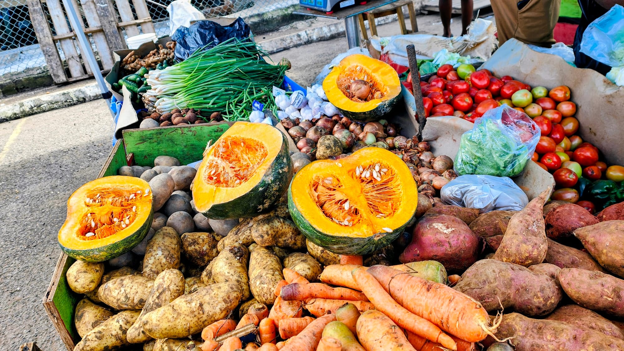 Then Ricky led us into the produce markets, open-air stalls under colored umbrellas, where vendors sold split pumpkins, scotch bonnet peppers, and fresh ackee from cardboard boxes. We bought star apples, which neither of us had tasted before, and ate them on the spot. We sampled everything. He navigated all of it without hesitation.