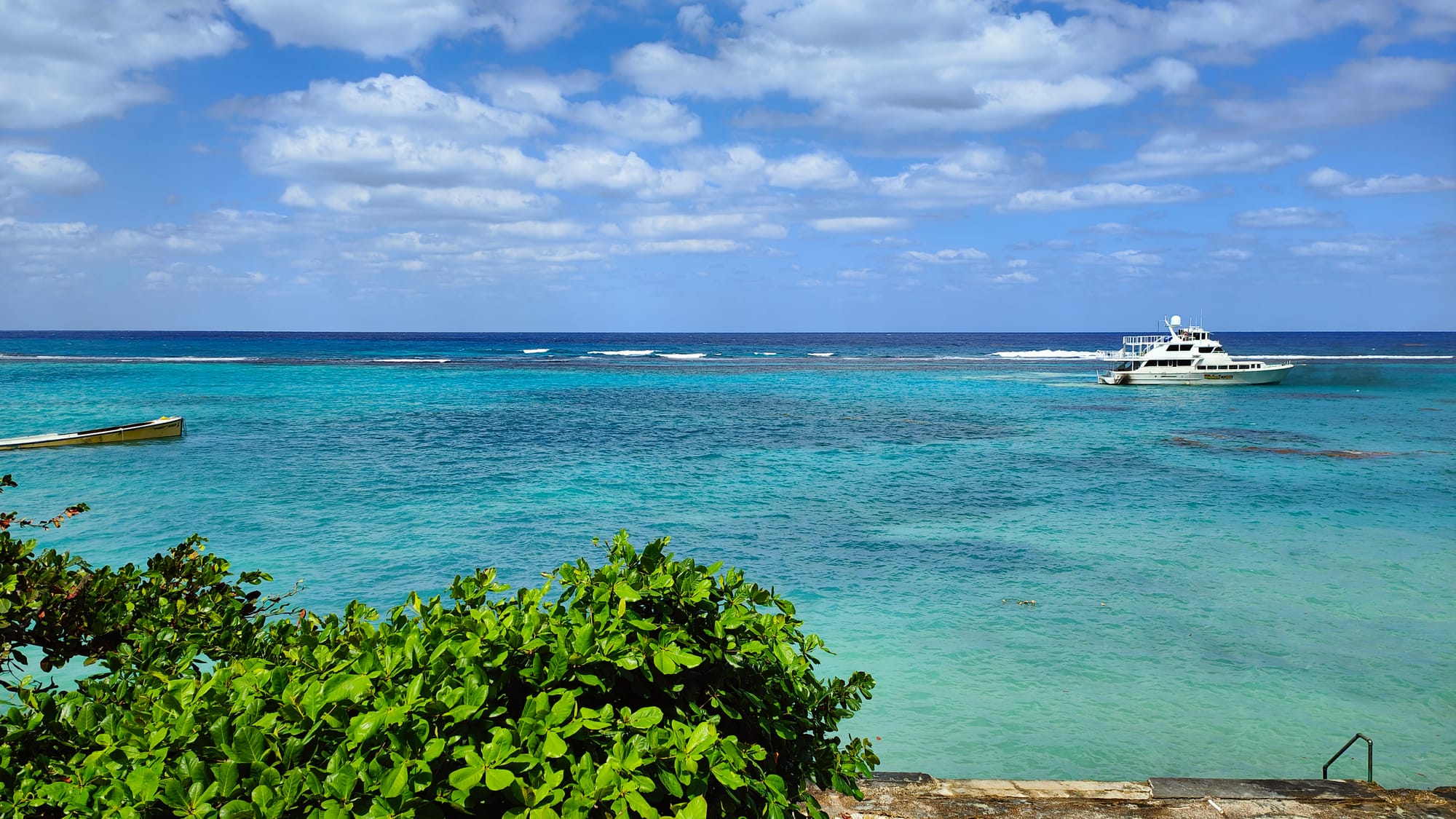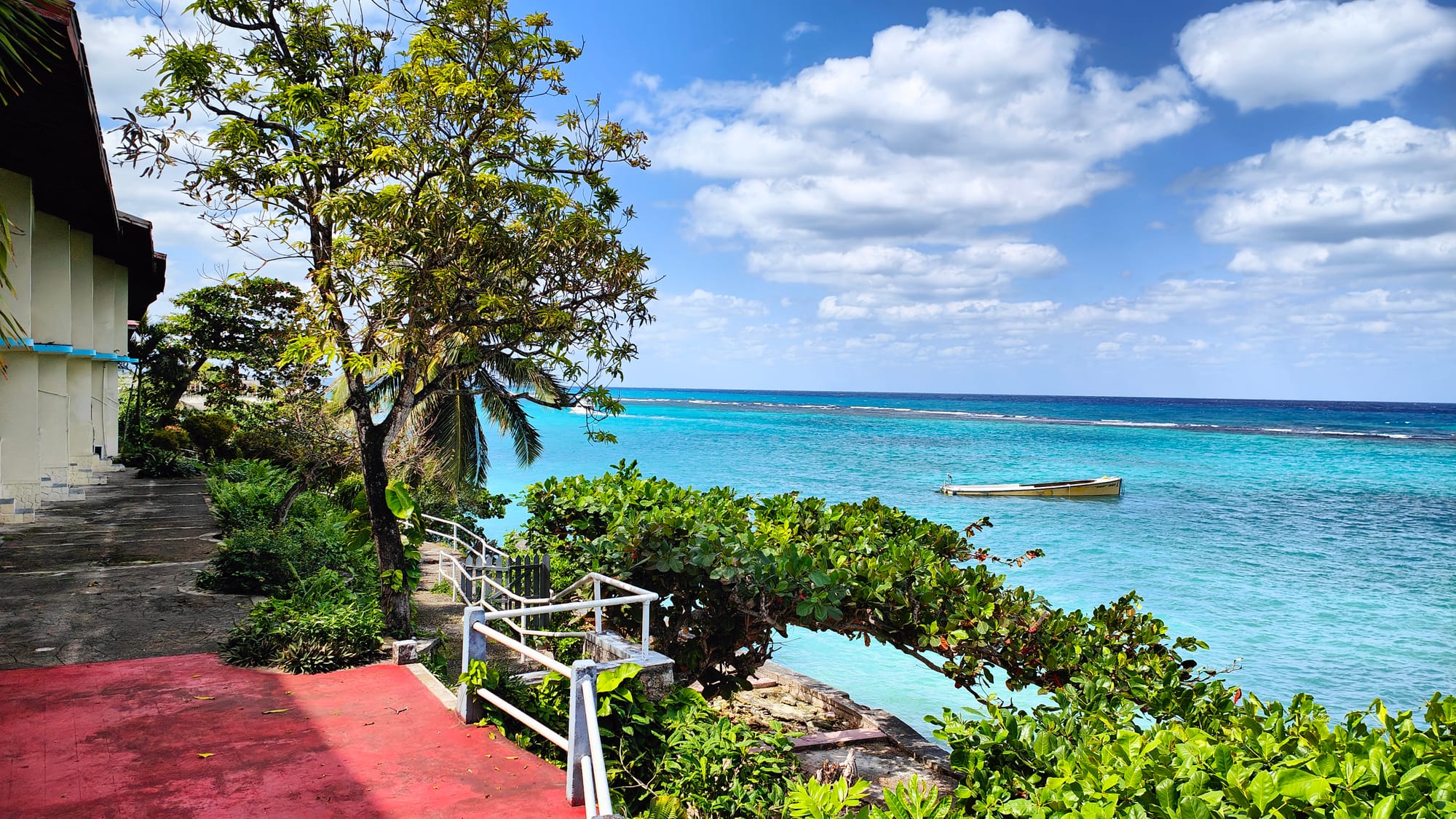 Three blocks from Moon Palace, tucked behind James Avenue, Ricky led us into the Silver Seas Hotel, a small, colonial-style property that has stood on the Ocho Rios waterfront since the late 1950s. The hurricane had hit it hard. The rooms were dark. The pool was drained. It could not accommodate guests. But the outdoor bar was functional, the staff was present, and the view from that red-painted terrace — over the old stone balustrade, past the sea grape trees, across a turquoise reef to the open Caribbean — was the most beautiful thing I saw in seven days on the island.