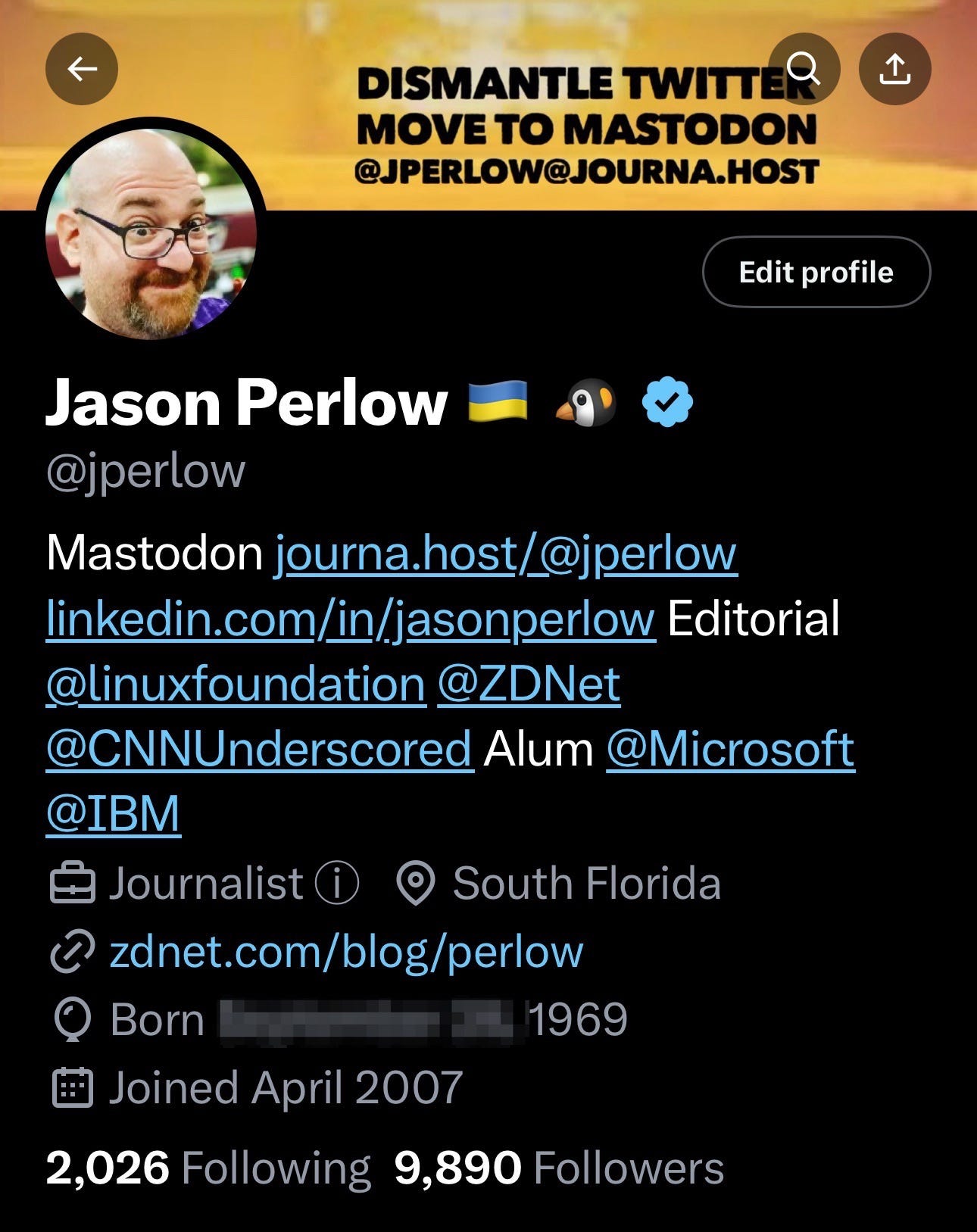 In anticipation of this, I took a screenshot of my profile page to remember it fondly. The Blue Check that indicates Verified status is on the same line as my name, with the Ukraine flag emoji and the penguin (for Linux, naturally.)