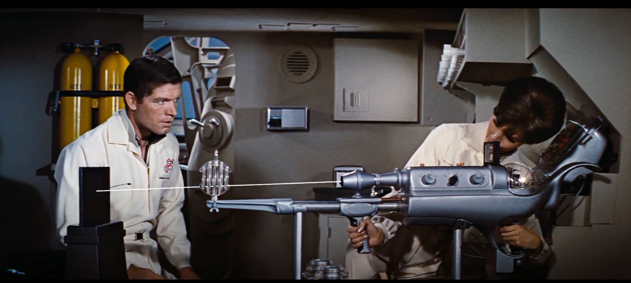 In addition to being notable for giving young boys heart palpitations with her bombshell figure and coyish smile, she also wielded one of the first film examples of a realistic laser gun (the first was in 1964’s Goldfinger) as the technology had only been demonstrated in 1960, just six years earlier.